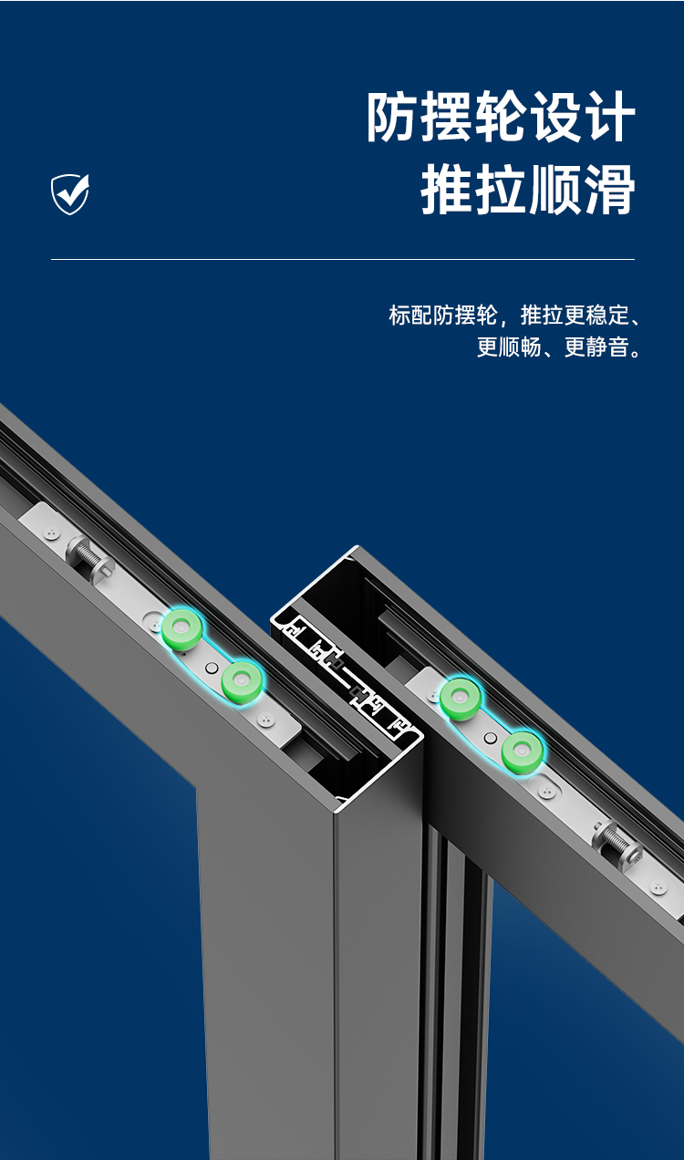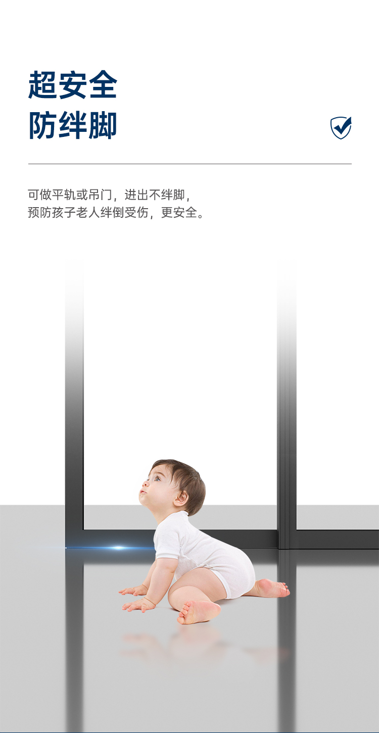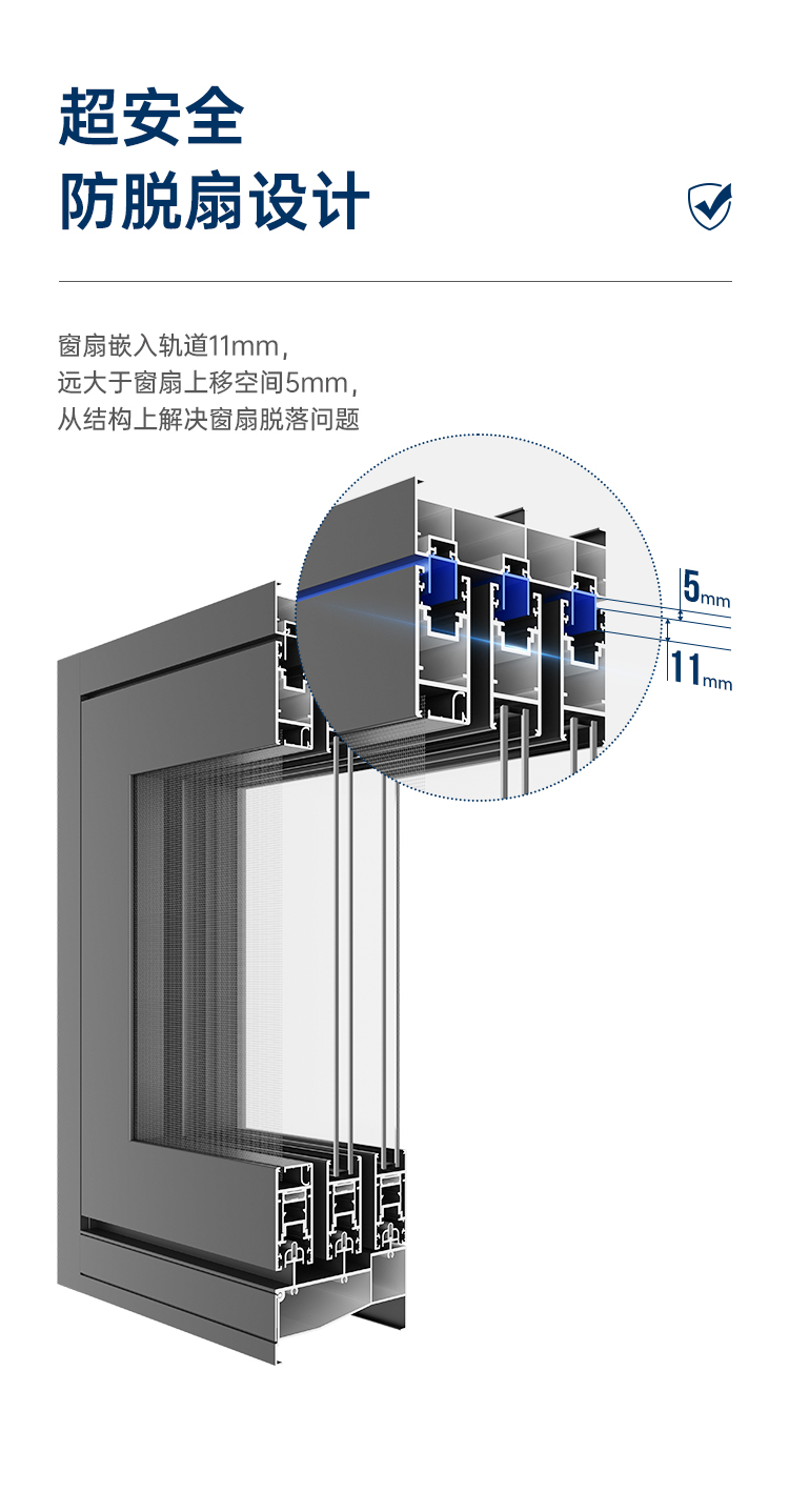 >超安全預防脫扇設計,預防窗扇掉落造成高空危害; >超安全防護格,24小時安心防護,遇意外,可開啟(選配); >不銹鋼下滑軌道,推拉更順暢、更靜音; >超安全防撬鎖點設計,更安全; >漏斗式排水軌道,無懼風雨。