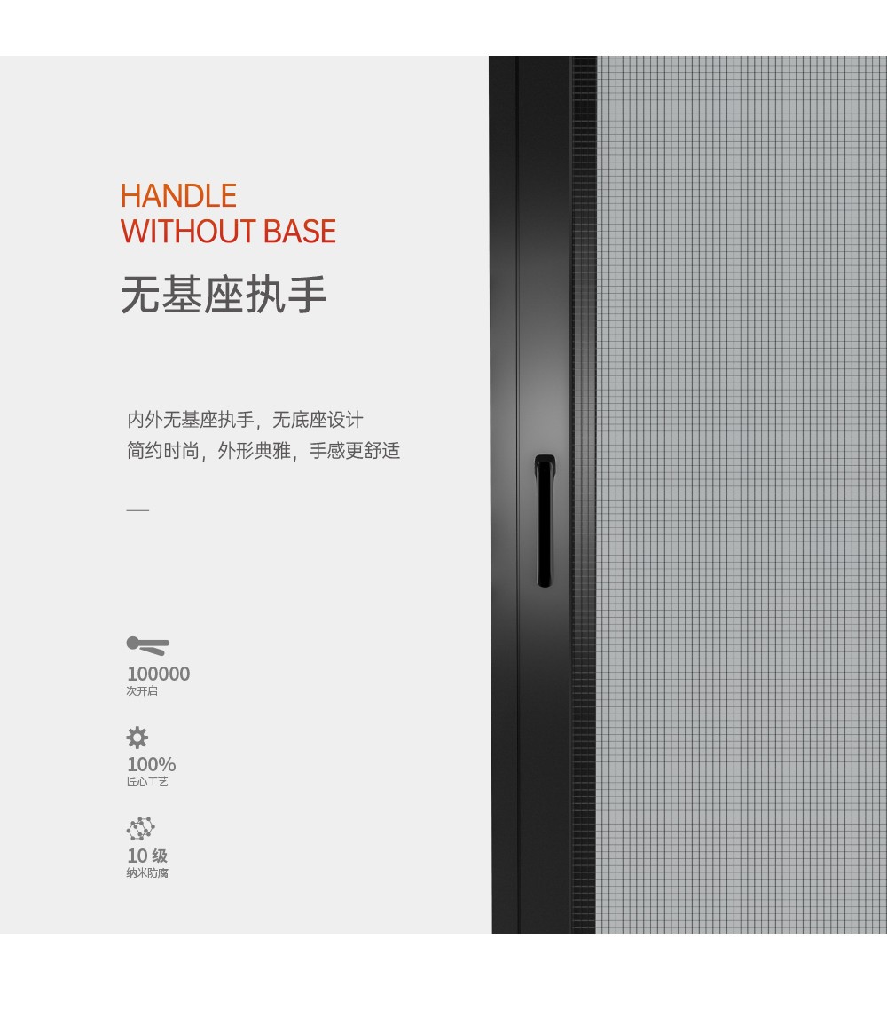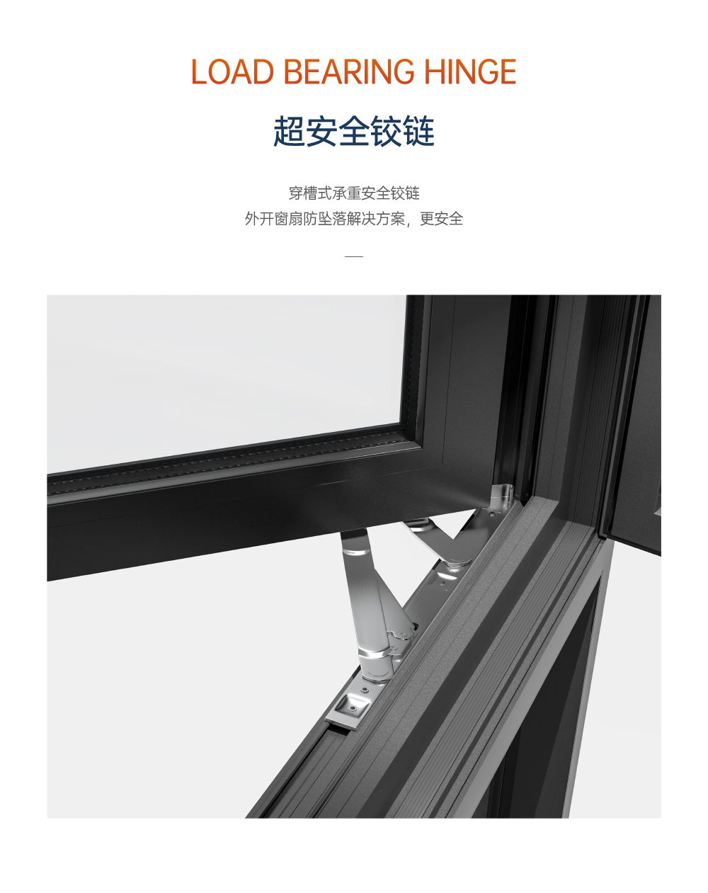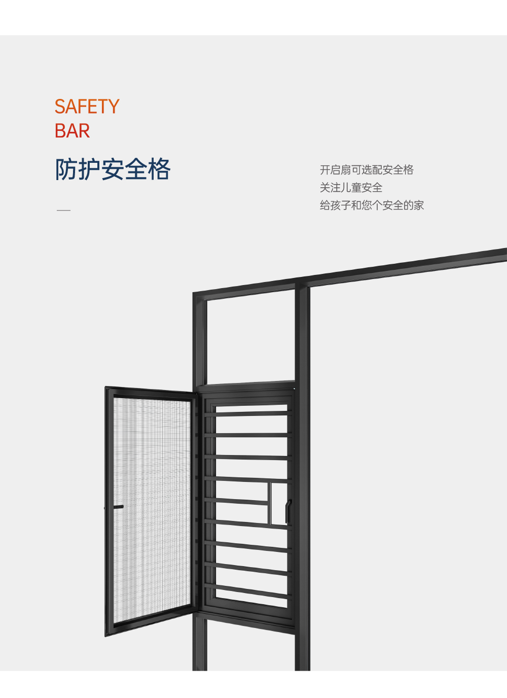 >超安全兒童防護裝置,10cm限位,安全通風 (選配); >超安全防護格,24小時安全防護 (選配); >超安全雙重護角,預防尖銳碰傷; >超安全強化鉸鏈,預防窗扇掉落造成高空危害; >銷釘注膠工藝,結構更安全牢固,防水性能更優越; >大中空鋼化玻璃,采用雙膠條減震密封設計,隔音效果更好; >汽車級密封膠條,更隔音,更耐候; >隱藏式下排水設計,防風嘯,防倒灌,顏值高; >撞色斜邊壓線,顏值更出眾。