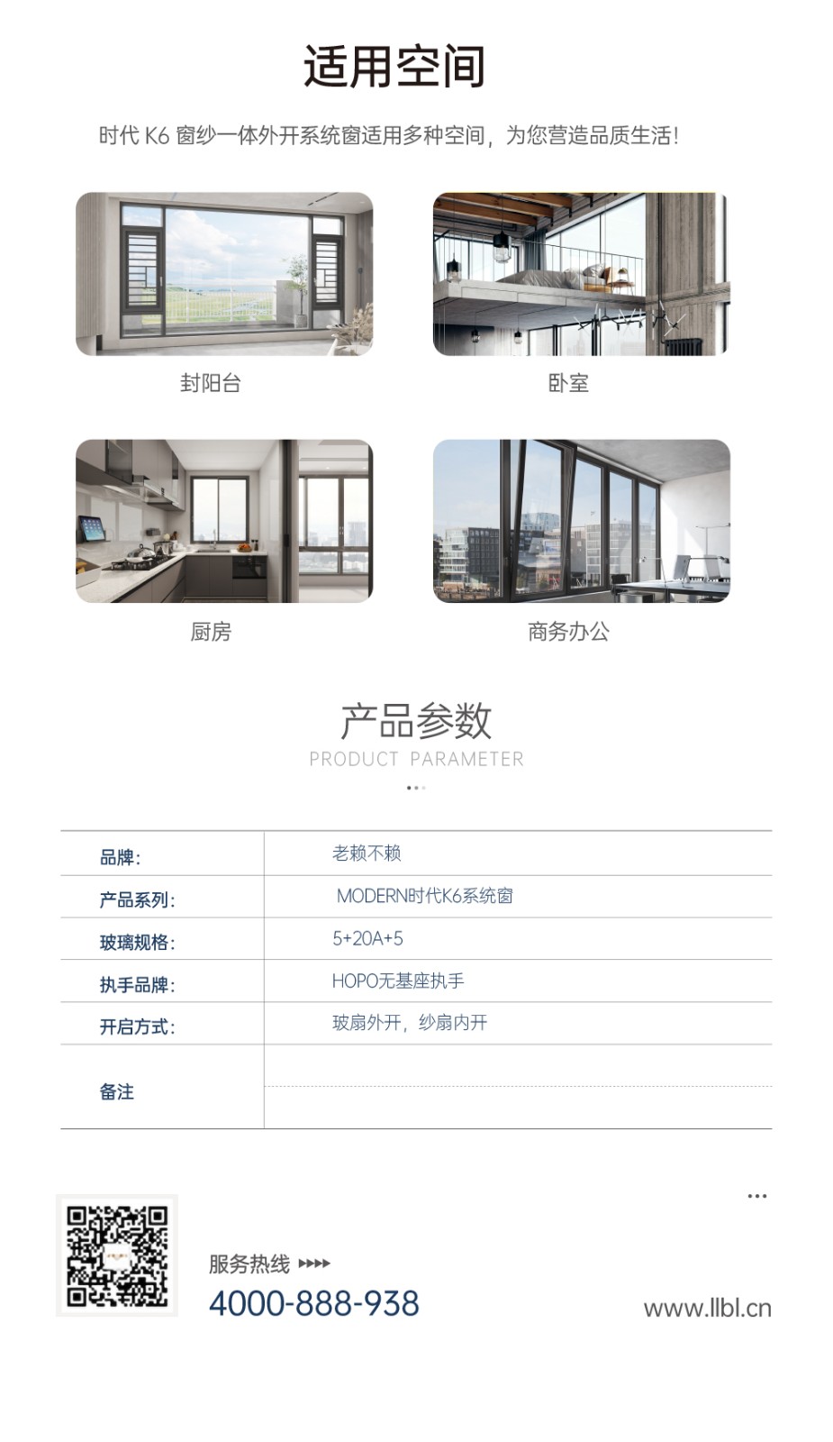 ■ 特殊配置(如更換五金件、中空格條、定制顏色、弧形、圓頭、轉角、開孔、包邊線等),需另外計價; ■ 所有平開窗單開和單個固定窗不足1.0㎡按1.0㎡計價; ■ 開扇面積:所有平開窗開扇面積≤1.0m2/套,超過1.0m2/套的需另外計價; ■ 以上單價未含運輸與安裝費、稅費; ■ 部分偏遠地區因物流等因素價格上浮10%為合理現象; ■ 更多詳情請登陸老賴不賴官方網站或掃產品二維碼查詢,網址:m.deliverybox.cn。