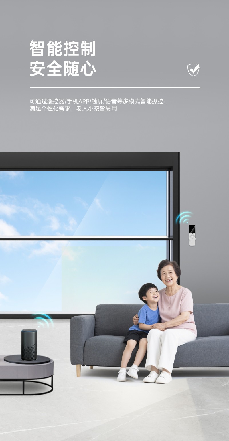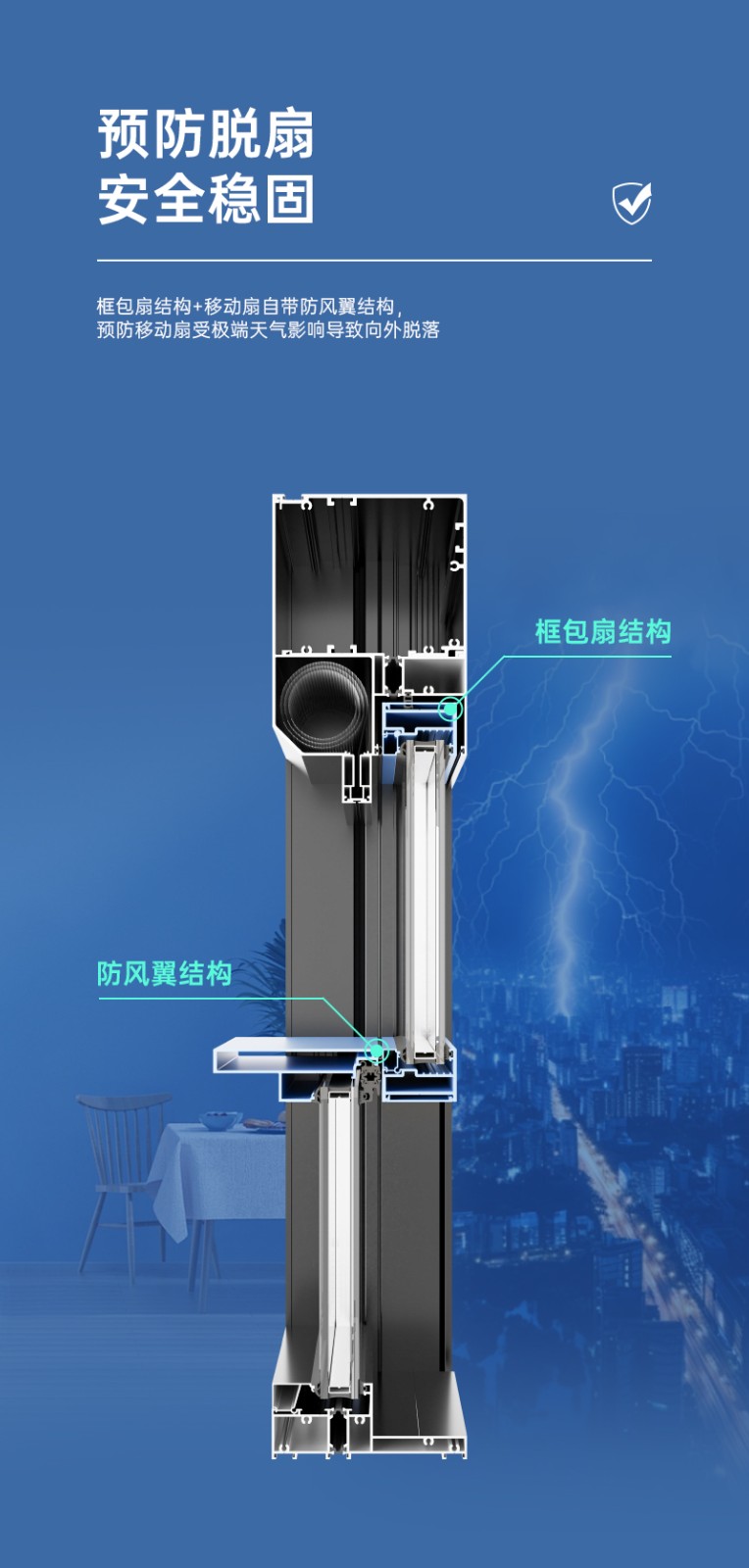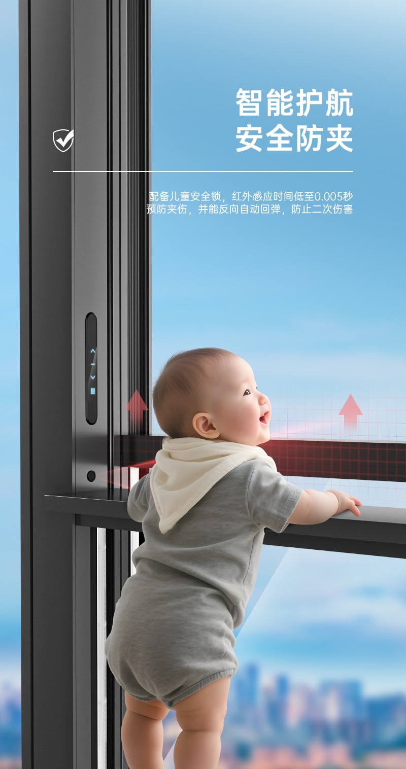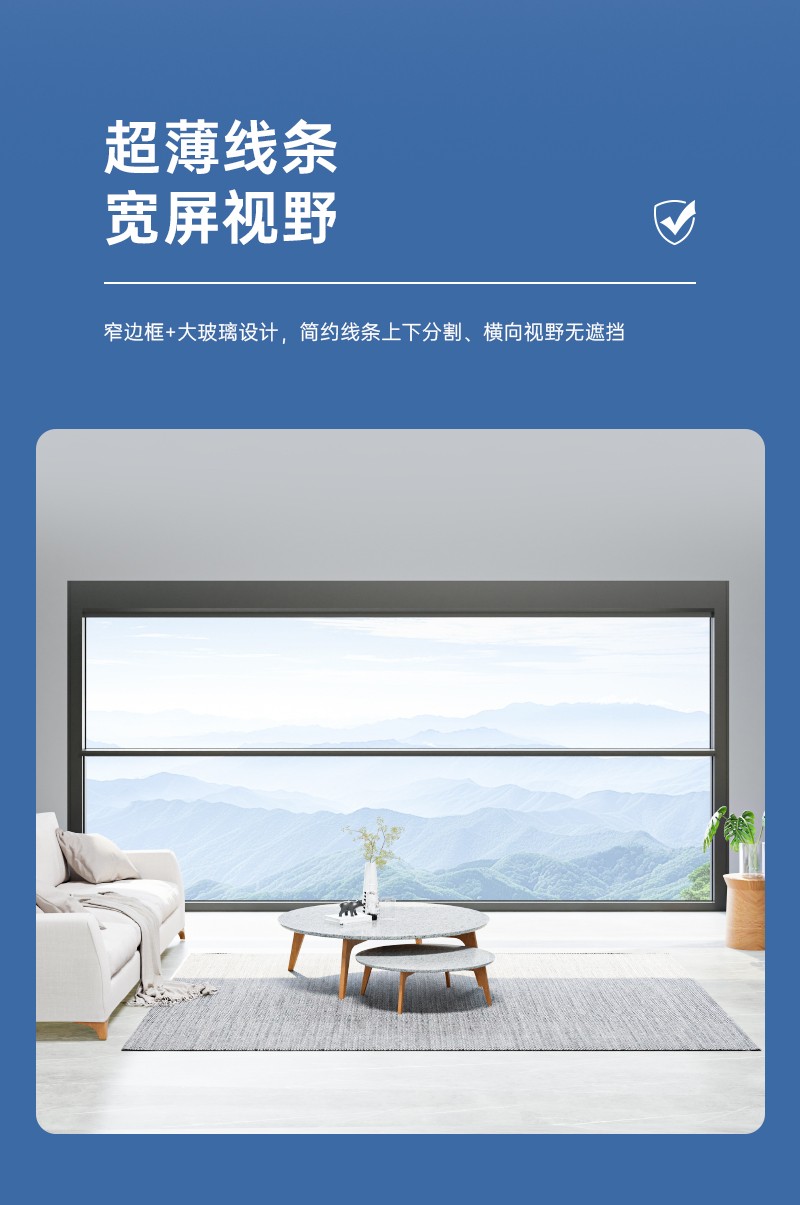 產品亮點?/ FEATURES 1.全景視野 窄邊框+大玻璃,上下分割,寬屏MAX視野,一覽無余 2.感官沉浸 下固定扇可當安全護欄,上活動扇可隨意高度懸停,隨心極致 3.品質超安全 中空安全玻璃,抗沖擊能力強,實力保護 4.性能超安全 移動扇獨創防風翼設計,確保極端天氣不向外脫落 5.防護超安全 可選配一體化操作隱藏式電動紗窗,通風防蟲,不占空間 6.超安全兒童安全鎖,智能防夾更安全 7.智控超安全 集成檢修、電源管理、消防聯動、智能家居互聯等功能為一體 8.安裝超安全 三分產品,七分安裝。獨有的快速調平結構,精準快捷安裝